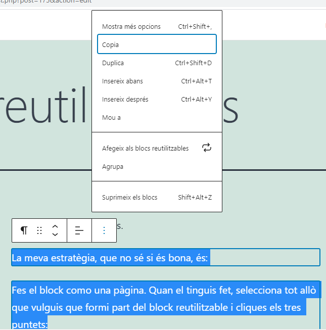 Fes el bloc como una pàgina. Quan el tinguis fet, selecciona tot allò que vulguis que formi part del bloc reutilitzable i cliques els tres puntets: